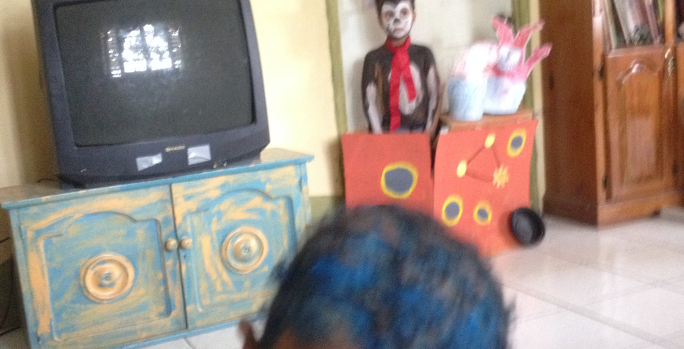 I started by getting two cardboard boxes and used the flips to assemble the smaller one to the back of on the larger box, next it was time to paint... I mixed red, yellow and orange watercoulours to get the ideal shade of orange plus to stretch the paint since the kids would be joining me and they're a lot more liberal in their application than I am.
